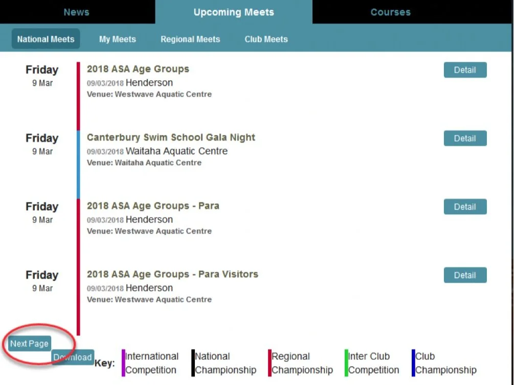 Also, at the time of writing the sub-headings “National Meets”, “My Meets, “Regional Meets” and “Club Meets” are incorrect. “National Meets” appears to list all meets.